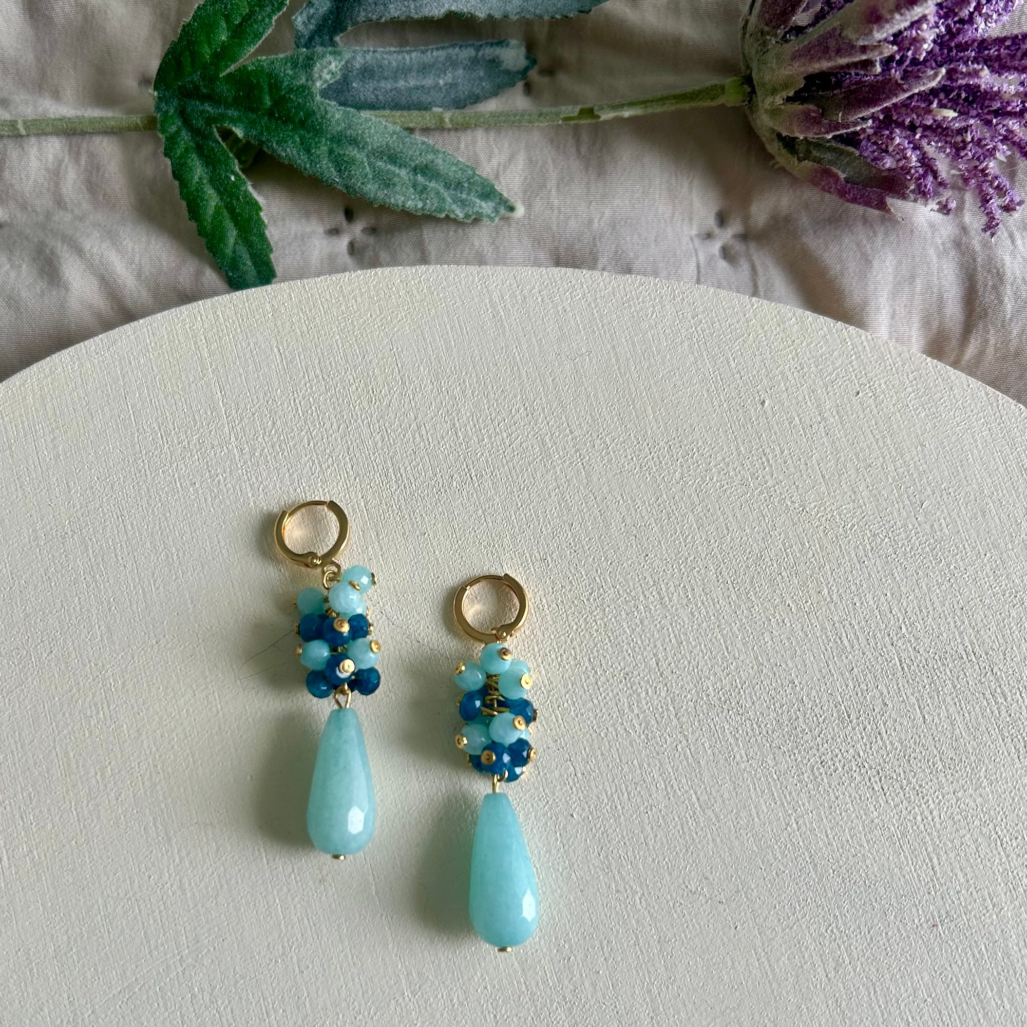 Pendiente aro dorado bañado con ágathas naturales tonos azules/